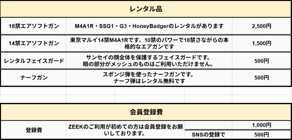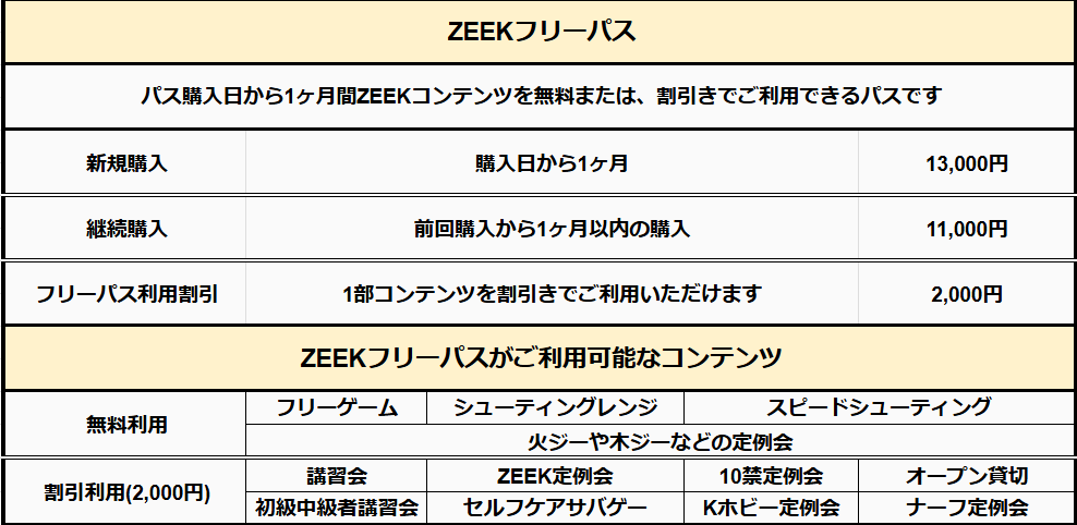 | ZEEKインドア初級講座 | ZEEKによるインドアでの戦い方を講習いたします 競技メインの講習会ではありません | 月1土曜日 |