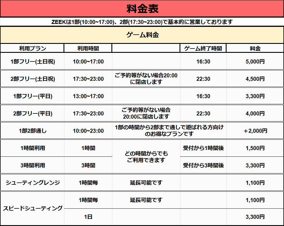 | ZEEKおためし定例会 | 当店の利用が初めての方、女性、学生が半額2,500円 バンカーと板バリケ複合の全面使用したレイアウト | 毎月第2土曜日 |